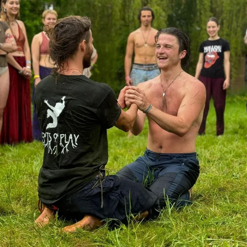 A significant turning point in my life occurred when I attended a men’s retreat with Menspidition, an experience that strengthened my sense of brotherhood and personal growth. This newfound perspective led me to meet Benji Roots at Primal Gathering in early 2023, where we discovered the transformative power of Playfight. I instantly knew this is what I was born to do. From then on, I trained as a Playfight facilitator and introduced Playfight at festivals, creating spaces where people could connect through spontaneous play and joy.